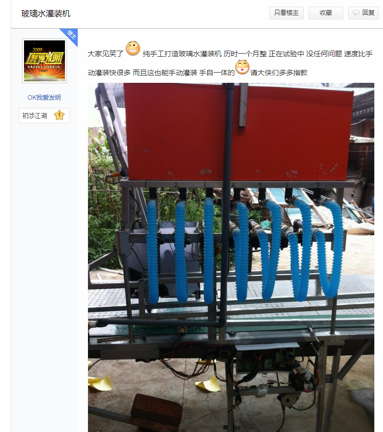 哦,天哪!看看百度貼吧初涉江湖的小發(fā)明,可是歷時一個月之久,而且尚在試驗中呢!各位親,省省功夫吧,來看看青州市惠聯(lián)灌裝機械有限公司生產(chǎn)的小型簡易玻璃水灌裝機,省時,省力,高效,而且價格還不高。